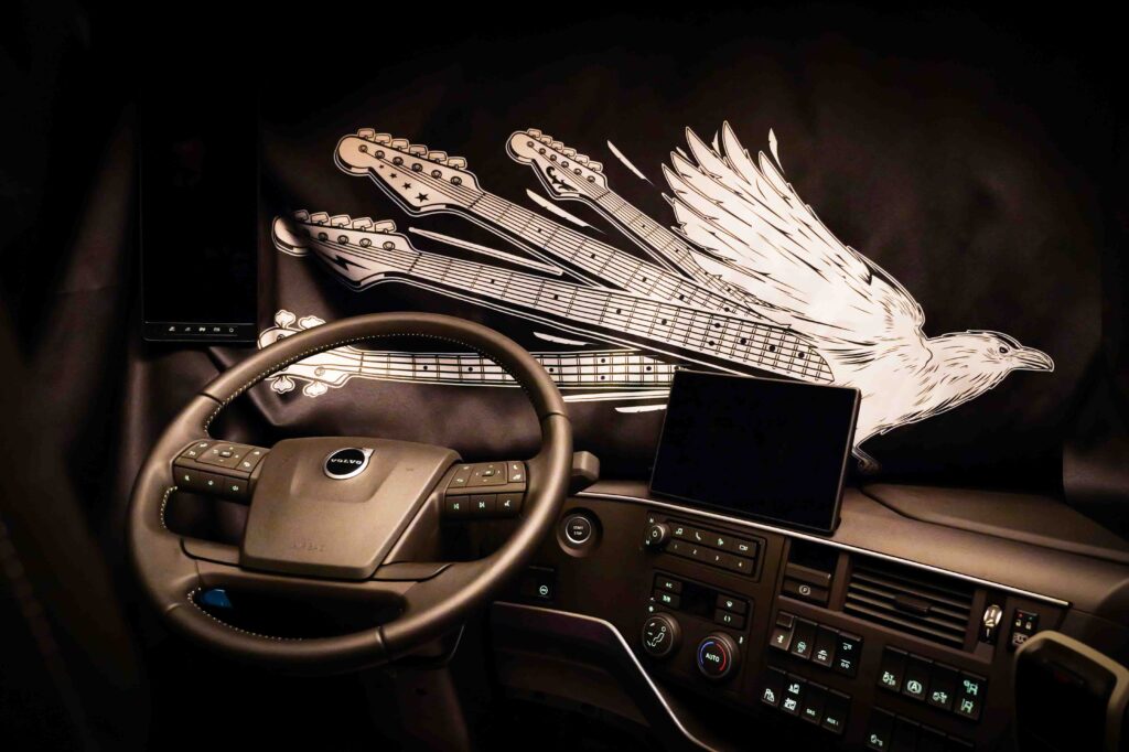 Opvallend is de matzwarte lak met een reflecterende afbeelding van een raaf op de cabinezijde – een knipoog naar zowel de metalcultuur als de Scandinavische mythologie. Ook het interieur is stevig aangepakt, met zwarte lederen bekleding, zilverkleurige stiksels en diverse details die doen denken aan een rocklounge. Denk aan gordijnen met ravenmotief, luidsprekerroosters met reliëf en denim trekbandjes met metalen studs.