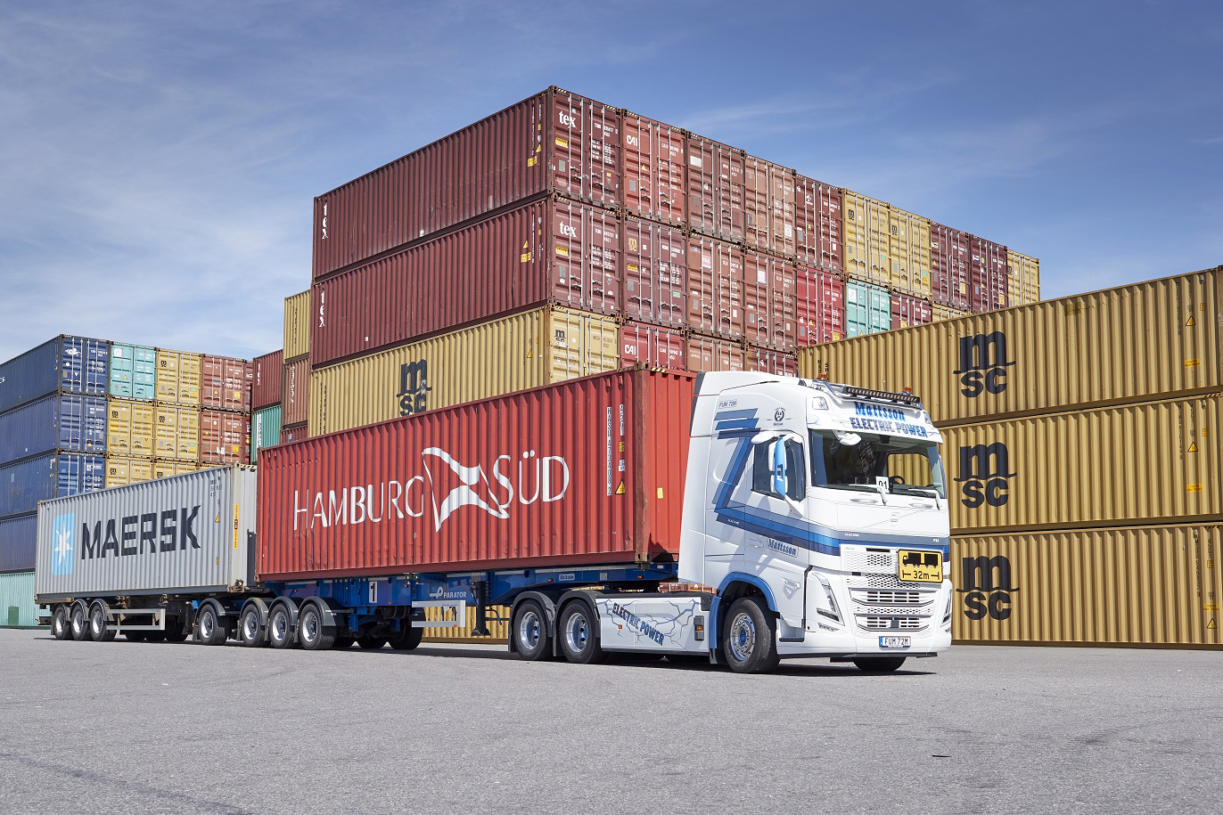 De afgelopen weken is een van deze trucks getest in het containertransport in het havengebied van Arendal in Göteborg. Het gaat om een zogenaamd High-Capacity Transport (HCT), in Nederland ook bekend als Super Eco Combi. De vrachtwagen met twee opleggers is 32 meter lang en heeft een bruto combinatiegewicht van 74 ton.