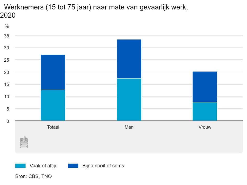 In 2020 zei 12,8 procent van alle werknemers van 15 tot 75 jaar vaak of altijd gevaarlijk werk te doen. In pre-coronajaren 2018 en 2019 was dit bijna 16 procent. Van alle werknemers kwam 14,4 procent tijdens het werk een enkele keer in een gevaarlijke situatie terecht. Bij de overgrote meerderheid (72,7 procent) was dit nooit het geval. Mannen doen vaker gevaarlijk werk dan vrouwen. Zo deed in 2020 17,5 procent van de mannen vaak of altijd gevaarlijk werk. Bij vrouwen was dit 7,7 procent.