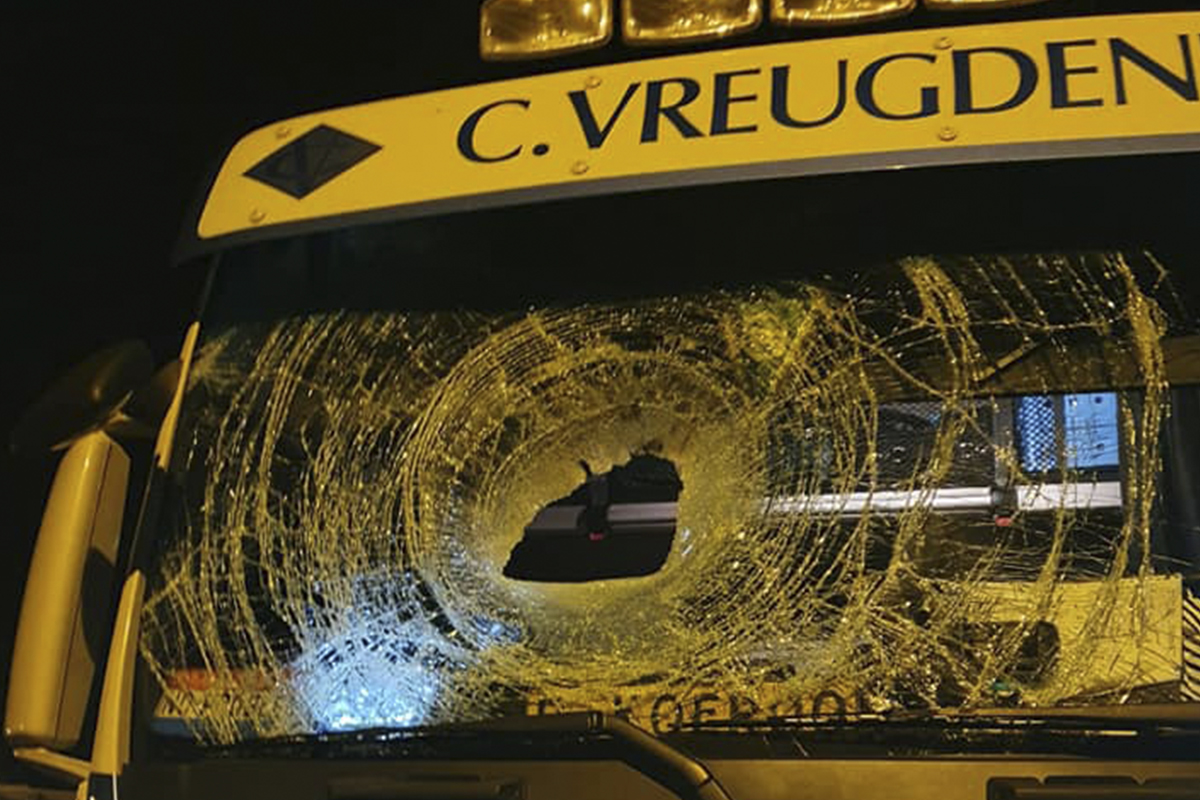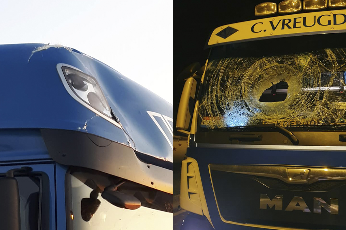Op advies van zijn werkgever reed hij door naar een bemand tankstation om daar de politie te bellen en de schade nader te inspecteren. Later is een truck van Vreugdenhil ten prooi gevallen aan eenzelfde incident. Op de foto’s is te zien dat de oranje zandzak door de voorruit op het bed van de chauffeur terecht is gekomen. Stel je voor dat dit object de chauffeur of bijrijder raakt…