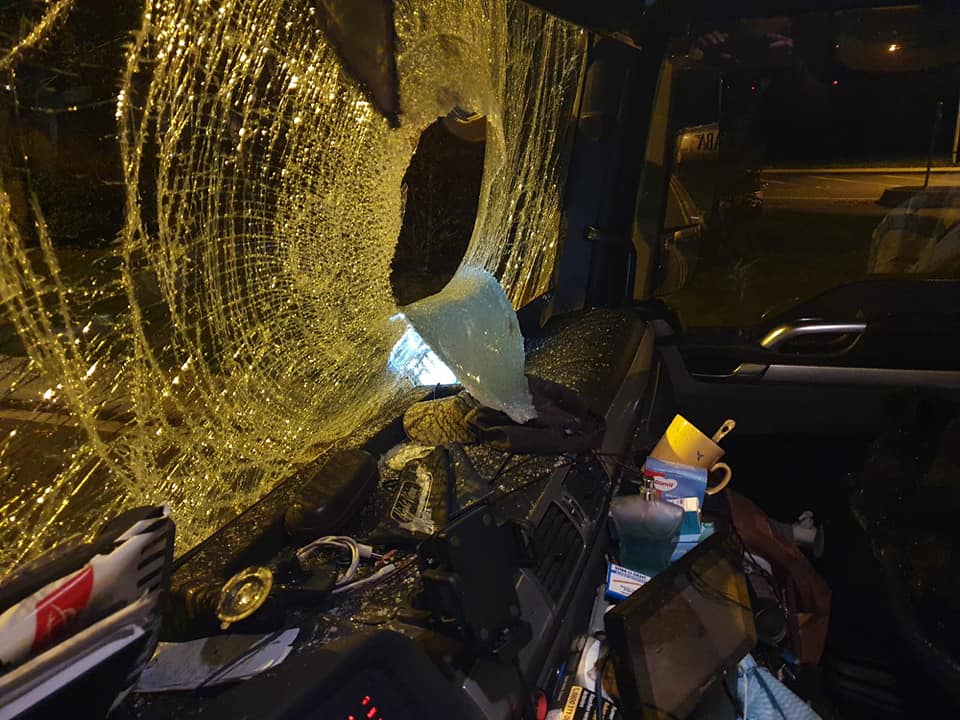 Vrachtwagenchauffeur Danny van Dijk rijdt voor De Wit uit Hillegom en deelt zijn verhaal op Facebook. “Allemaal even opgelet, de afgelopen weken zijn er tussen Lille en Parijs een paar debielen actief die het leuk vinden om troep vanaf het viaduct te gooien. Ik heb het zelf drie weken geleden ervaren op een zondagavond rond 23 uur ter hoogte van afslag Roye. Zat lekker te sturen in het pikdonker en opeens een bizarre klap op mijn cabine. De binnenkant kwam deels los, kasten sprongen open en het plafond klapte naar beneden.”