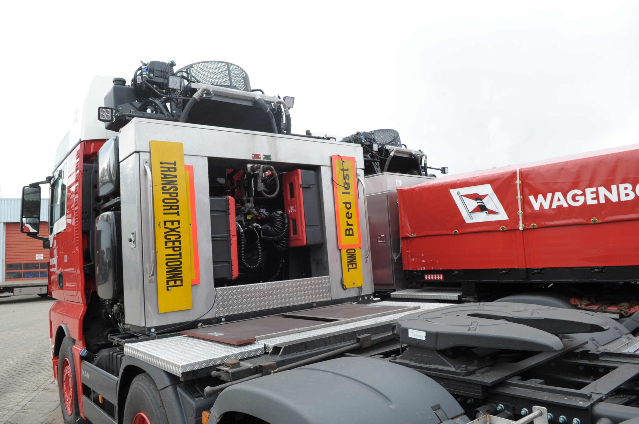 De vier assige MAN-trekkers zijn voorzien van de XXL- cabine, met stand-airconditioning. ,,Wij werken veel in Duitsland en daar mag in veel gevallen overdag niet gereden worden. Dat betekent dat de chauffeurs overdag in de cabine slapen, en dan wil je, ook in de zomermaanden een goed klimaat aan boord. Verder zijn de trucks voorzien van alle luxe om comfortabel langdurig in de cabine te kunnen verblijven’’, aldus Boerema. De voertuigen zijn voorzien van de nieuwste versie van de D38 krachtbron. Deze zescilinder levert 640 pk en is gekoppeld aan een geautomatiseerde TipMatic-versnellingsbak met koppelomvormer. Achter de cabine is af-fabriek een rek gebouwd met onder meer de speciale koeler voor de WSK en een 960 liter brandstoftank. Verder zijn er in het rek extra luchtketels en een 290 liter hydrauliekolie tank gebouwd.