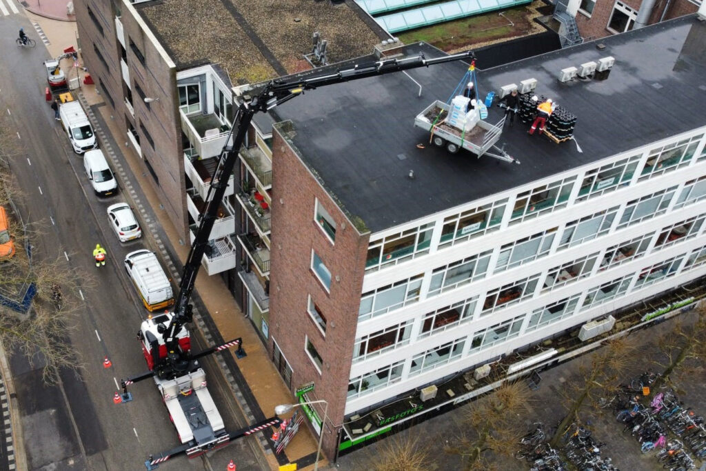 De nieuwste aanwinst werd de volgende dag direct ingezet. Op een bouwlocatie vlak naast de Martinitoren, midden in het centrum van Groningen, kreeg het team van Wagenborg Nedlift de opdracht om bouwmaterialen op het dak te zetten. Een uitgelezen klus voor Johannes en zijn nieuwe kniktelescoopkraan. Dankzij de snelle opbouwtijd en beperkte benodigde opstelruimte konden de hijswerkzaamheden veilig, efficiënt en zonder hinder voor de omgeving worden uitgevoerd.