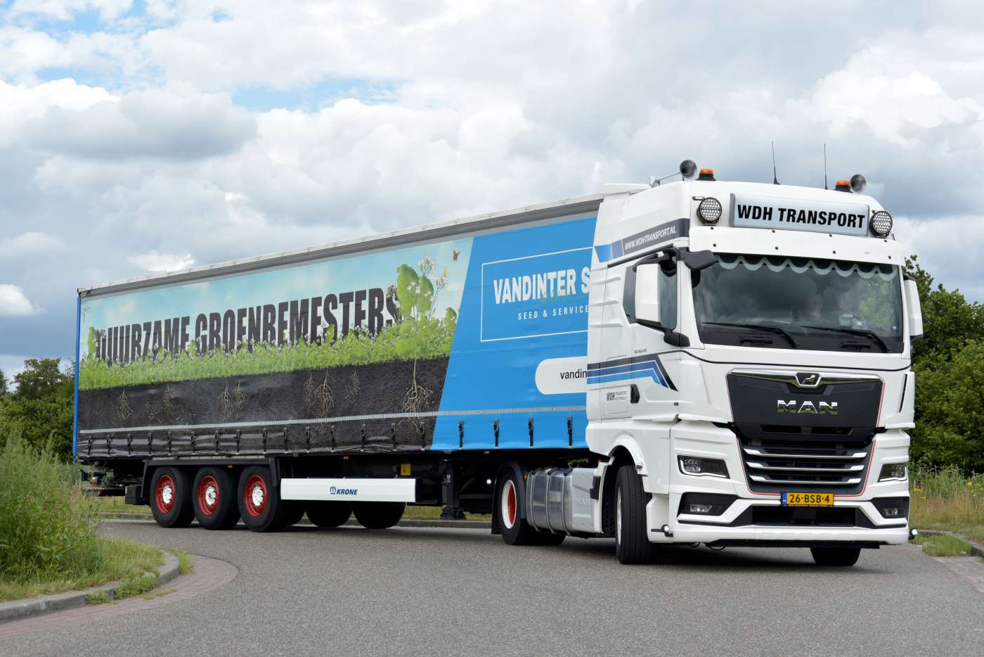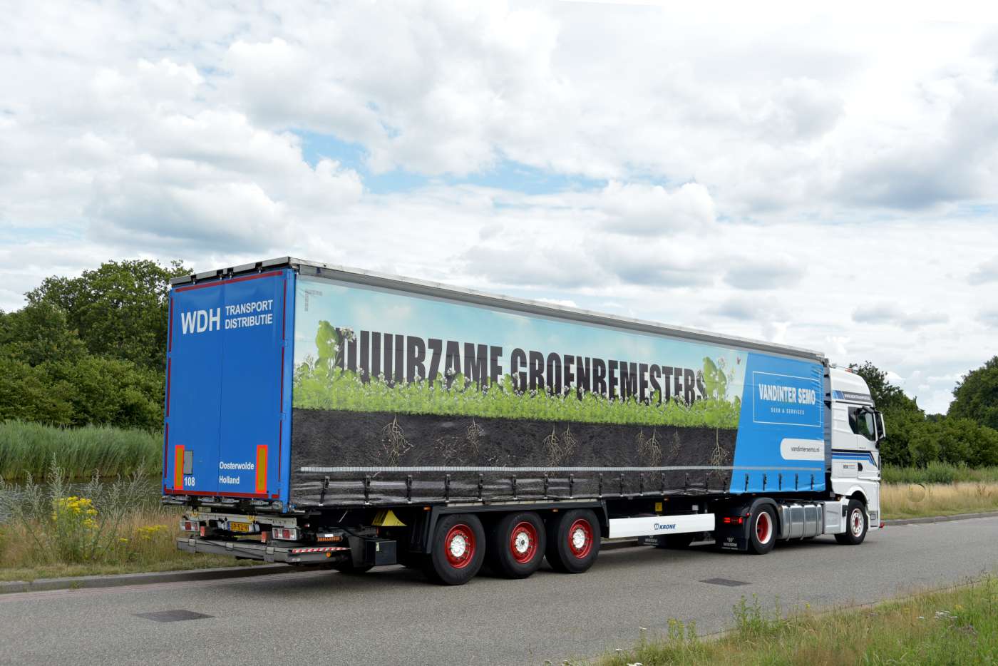 WDH maakte een stormachtige ontwikkeling door sinds de start, en één van de klanten die gebruik ging maken van hun services was Vandinter Semo Seed & Services. “Wij zijn één van hun vaste vervoerders binnen Nederland en België. Toen wij dat werk kregen hebben we een, snel leverbare Krone schuifzeil oplegger met laadklep in gebruik genomen die voorzien is van hun reclame. De, amper drie jaar oude oplegger werd keurig nieuw gespoten afgeleverd en met de nieuwe zeilen is hij niet van nieuw te onderscheiden,” aldus Klaas Peter Mulder.