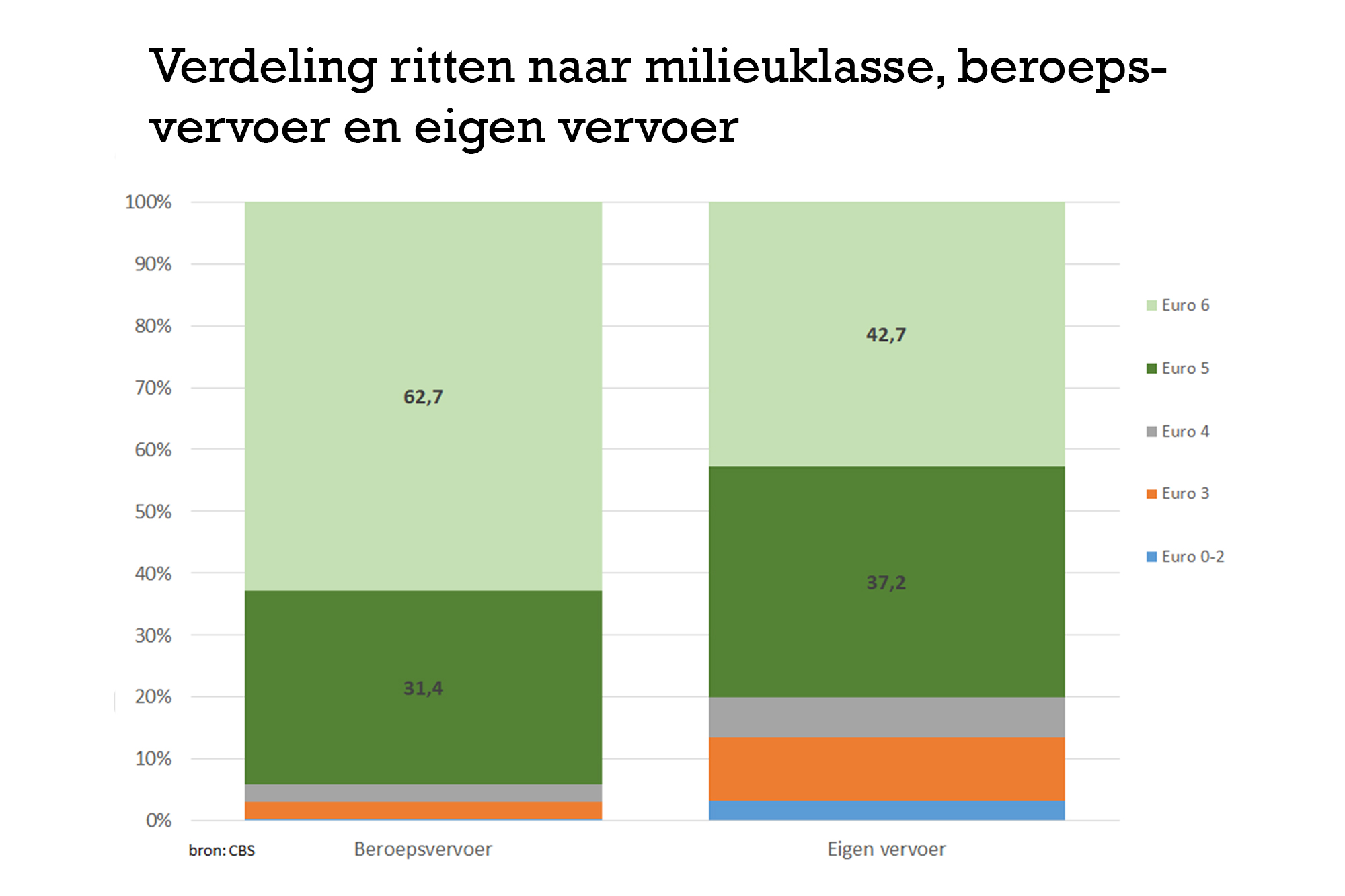 In het internationale wegvervoer vanuit en naar Nederland kwam 95 procent van alle ritten voor rekening van vrachtauto’s met een Euro 5- of Euro 6-motor. Deze voertuigen zijn schoner in gebruik en worden in het buitenland minder zwaar aangeslagen bij tolheffingen. In Duitsland betaalt je bijvoorbeeld voor een vrachtauto met een Euro 6-motor ruim 20 procent minder tol dan voor een vrachtauto met een Euro 3-motor.