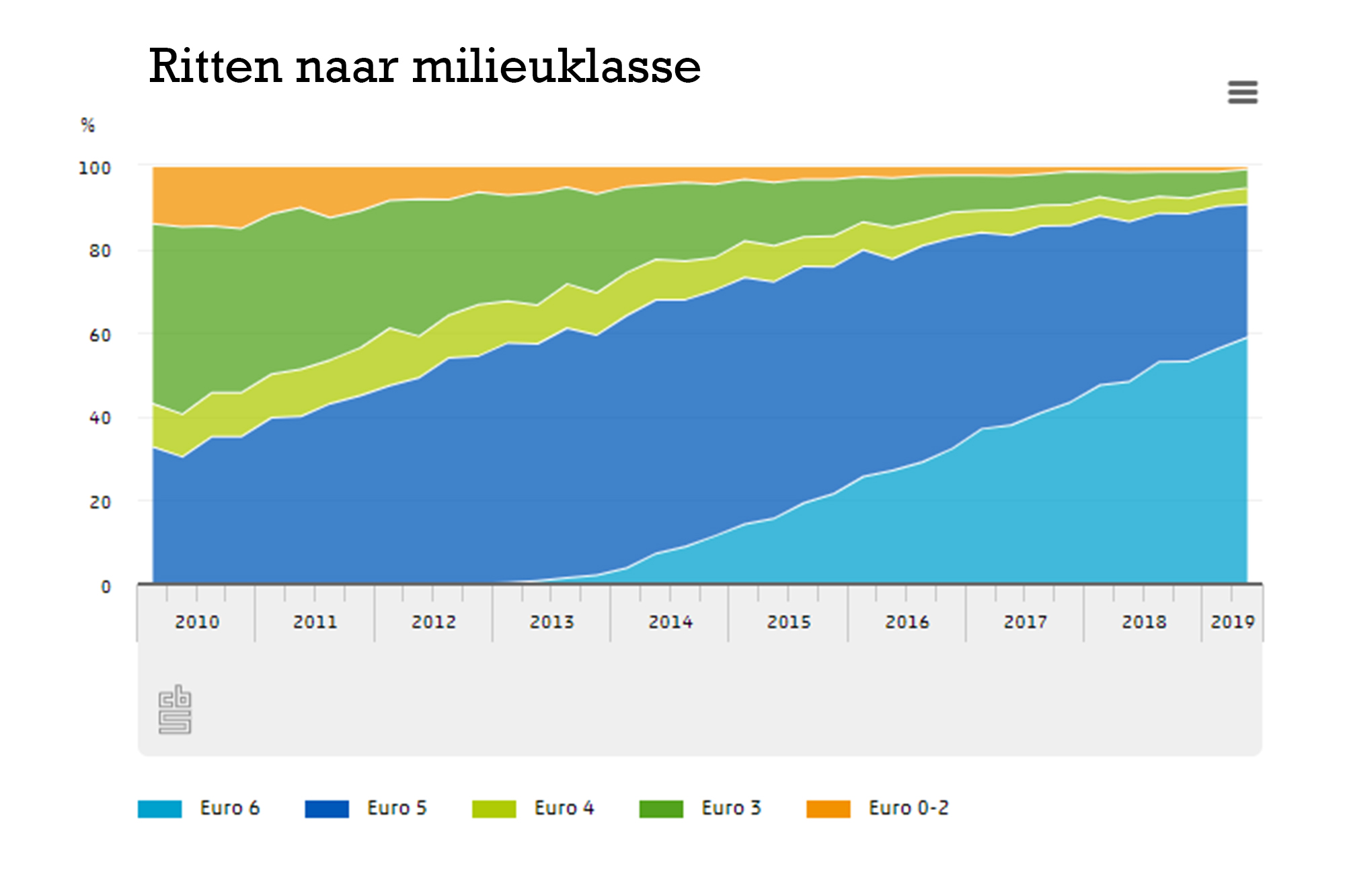 Dit meldt het CBS op basis van nieuwe cijfers. Sinds de introductie van de Euro 6-milieuklasse in 2013 neemt het gebruik hiervan elk kwartaal met gemiddeld 2,2 procentpunt toe. Euro 6-motoren stoten 97 procent minder stikstof uit dan motoren uit de Euro 1-klasse. Ten opzichte van motoren uit de Euro 5-klasse is de uitstoot van stikstof door Euro 6-motoren verder teruggebracht van 2 gram naar 0,4 gram per kilometer. De uitstoot van fijnstof is bij Euro 6-motoren de helft van de uitstoot bij Euro 4 en Euro 5-motoren.