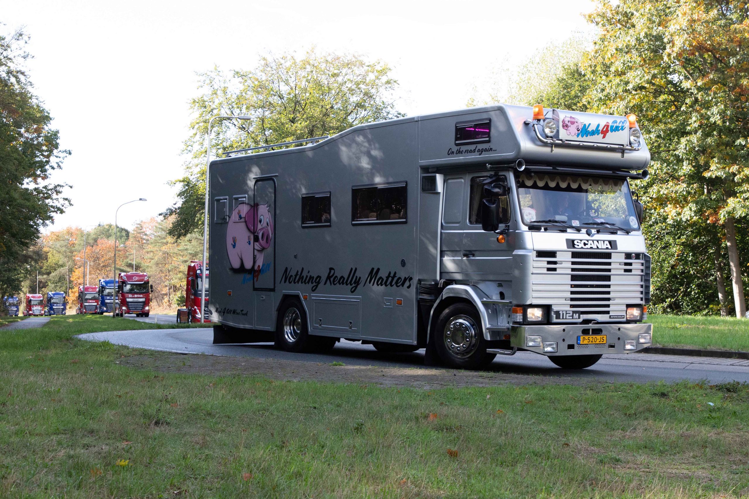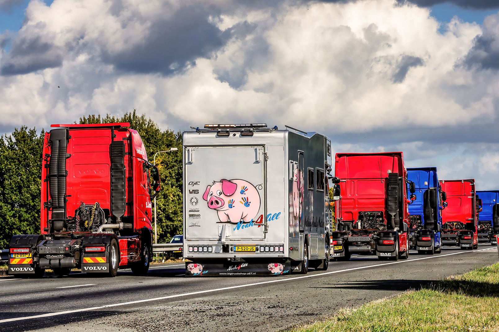 Tussen het fraaie konvooi zat ook de droomauto van Sandra, de Kenworth W900 van Arie Kandt. De bestemming, waar wij de overstap konden doen naar de truck van Arie, lag in Ermelo. Tijdens de rit werd de Noah4All Wenstruck ingehaald door het complete konvooi. De jake brake van Arie deed haar schateren, Arie snapte het spelletje en de jake brake had het zwaar.