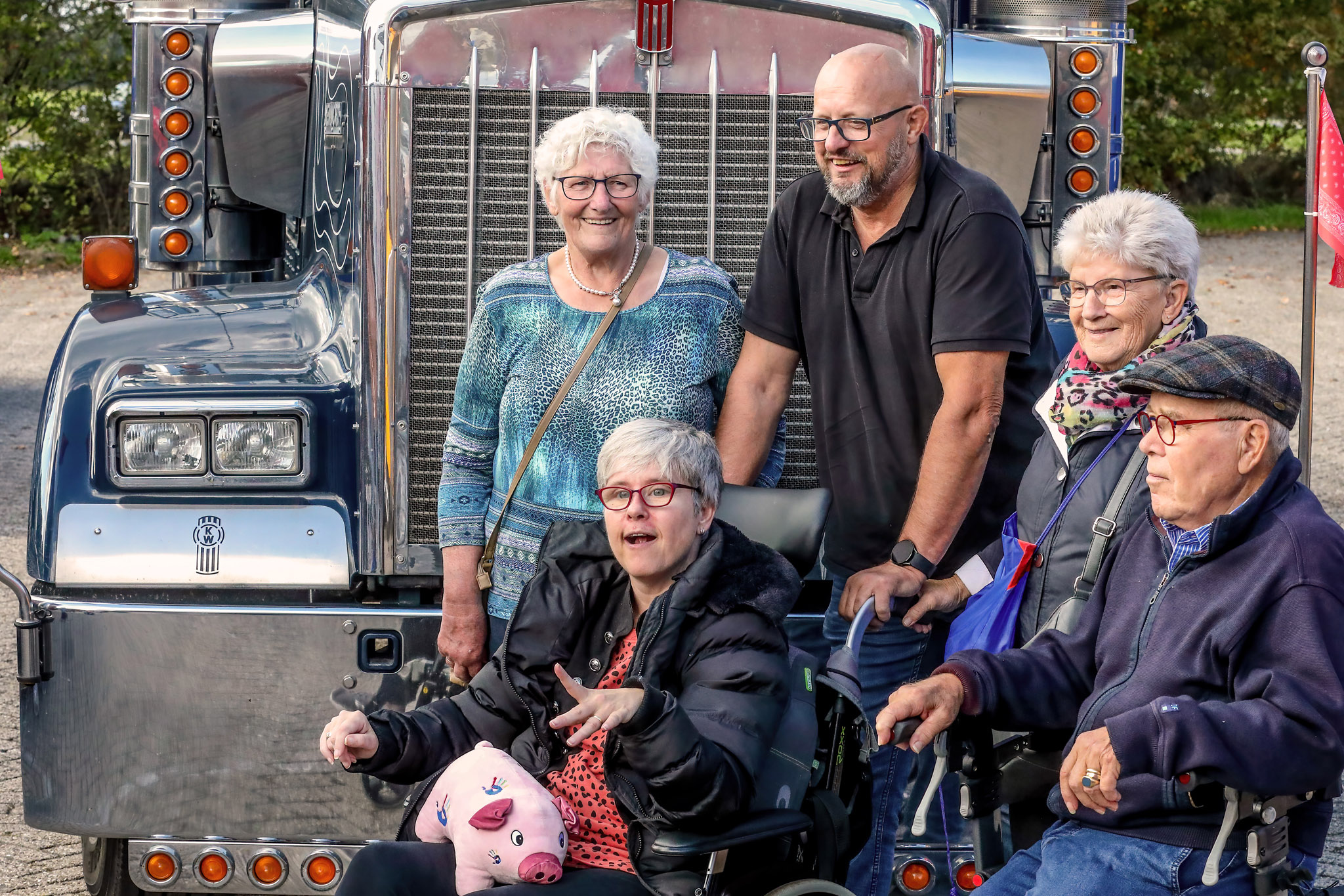 Zonder enige vorm van belemmering zat zij weer in de truck, getroond in haar eigen zetel, met zicht op de truck van Wim. Wim leidde met zijn vrachtwagen het Noah4All-konvooi. Trotser kan je haar niet maken, haar wereld was nu even zonder al die beperkingen. “Gas erop,” was haar decreet en dat begrepen wij wel. Even weg van het verzorgingshuis, omringd door familie en samen met de fantastische collega’s van Wim, hoe mooi is het leven nu. Ook Sandra’s verzorgster Romy, dia haar begeleide, genoot zichtbaar.