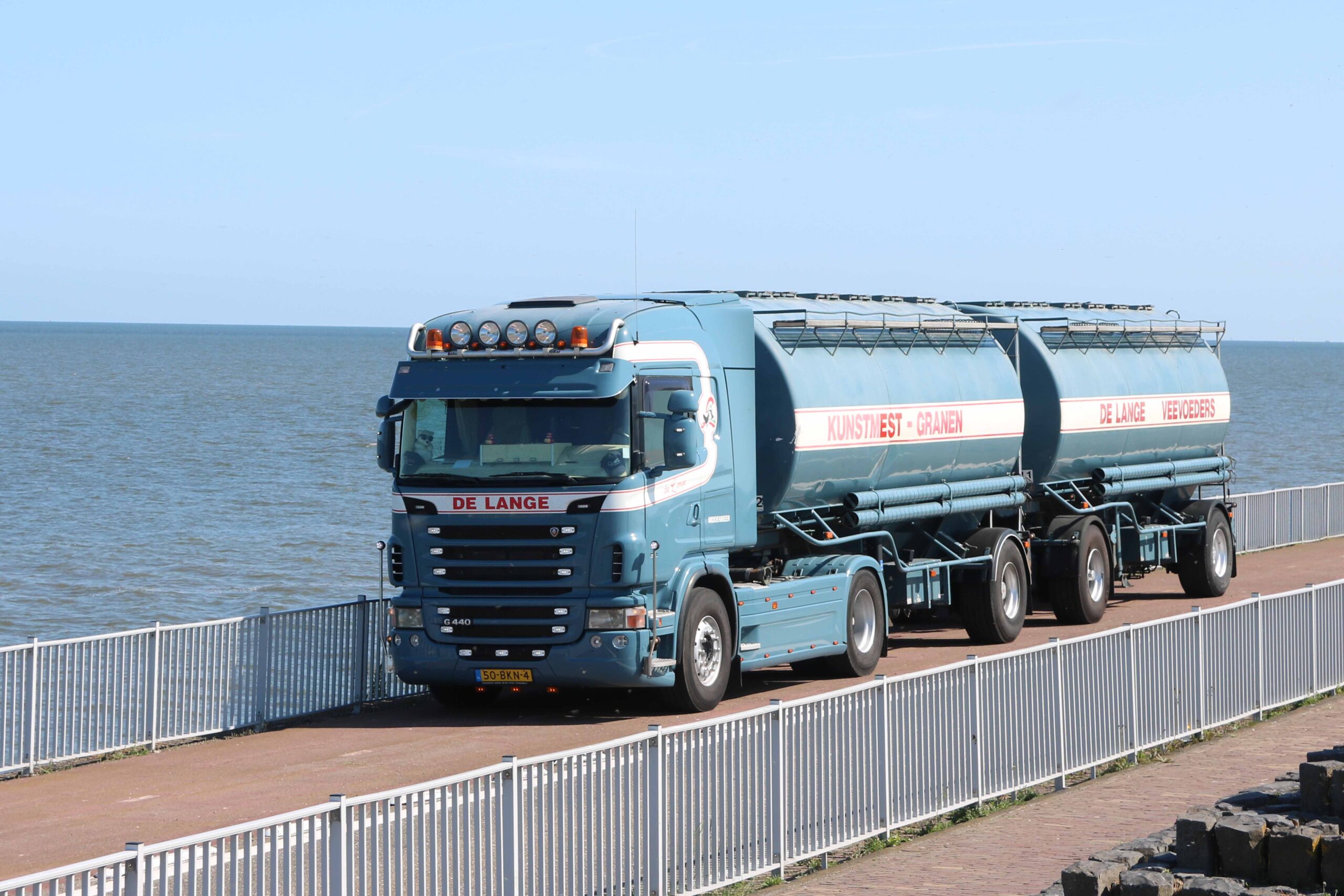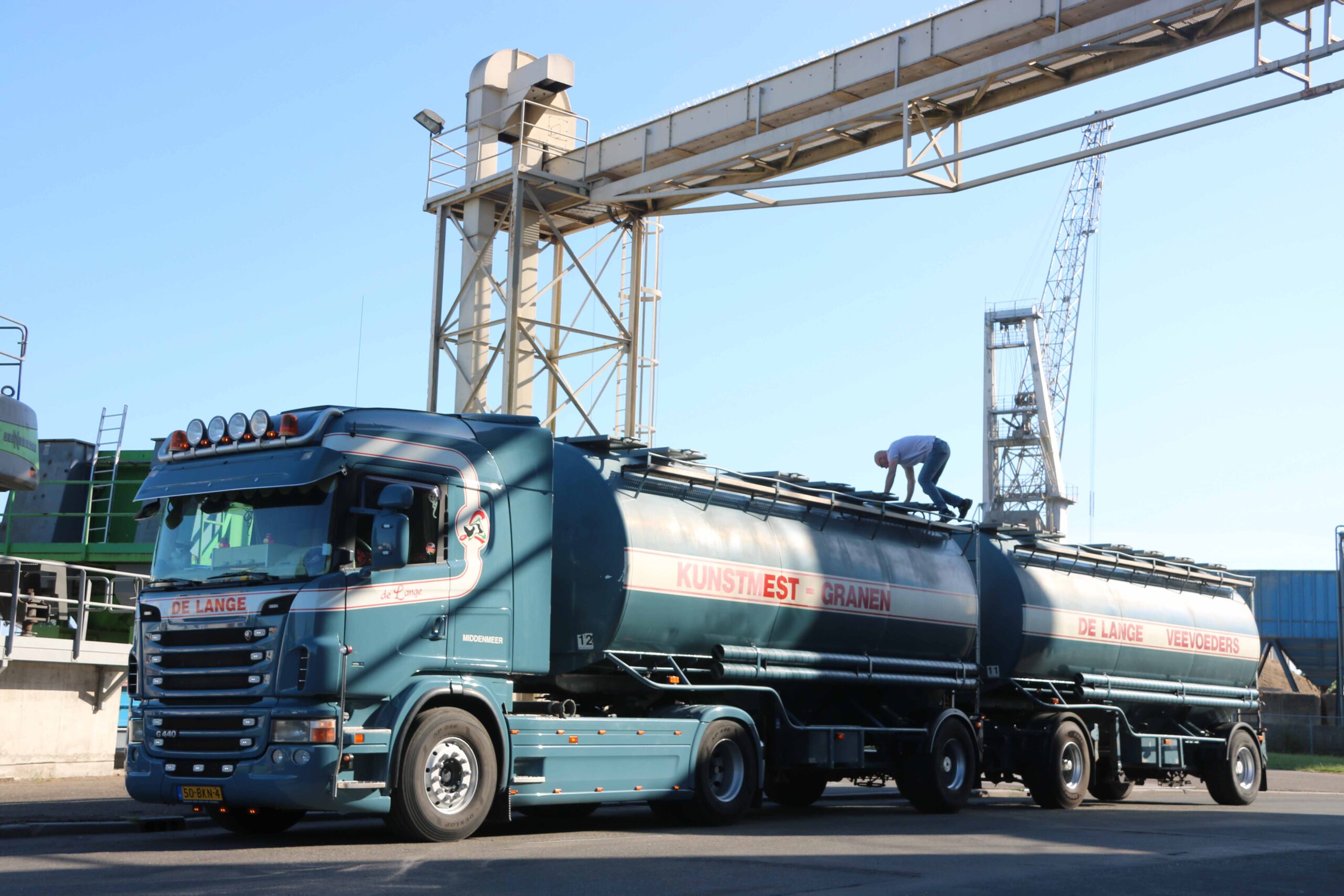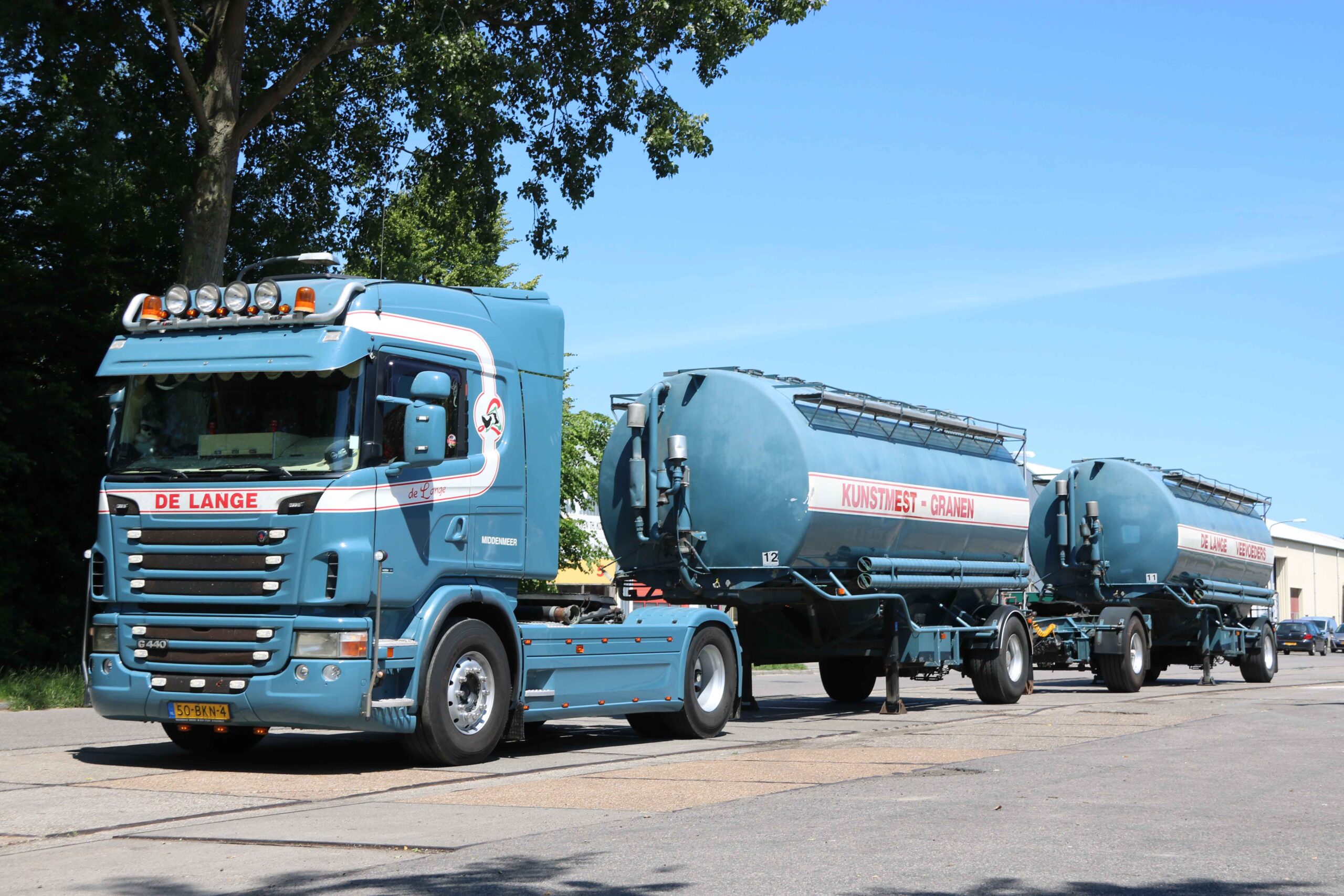 De combinatie van Jerry is ‘slechts’ achttien meter lang en bestaat uit een trekker en twee opleggers. Het geheel begint met een Scania G440 uit 2012, daarachter hangt een bulktrailer, gevolgd door een dolly uit 1977, waar dan nog weer een bulktrailer aan vast zit. Bij beide trailers stamt de opbouw uit 1993. “Deze combinaties mogen zo niet meer worden gemaakt”, zegt Jerry op een vroege zomerse dinsdagmorgen. “De combinatie heeft drie knikpunten, waarvan het achterste, het trekoog van de dolly, akelig dicht bij de schotel van de achterste oplegger komt. Als ik met deze twee opleggers achteruit rijd, is er nauwelijks mee te sturen. Twintig meter achteruit gaat nog wel, maar een straat insturen, is al een stuk lastiger.”