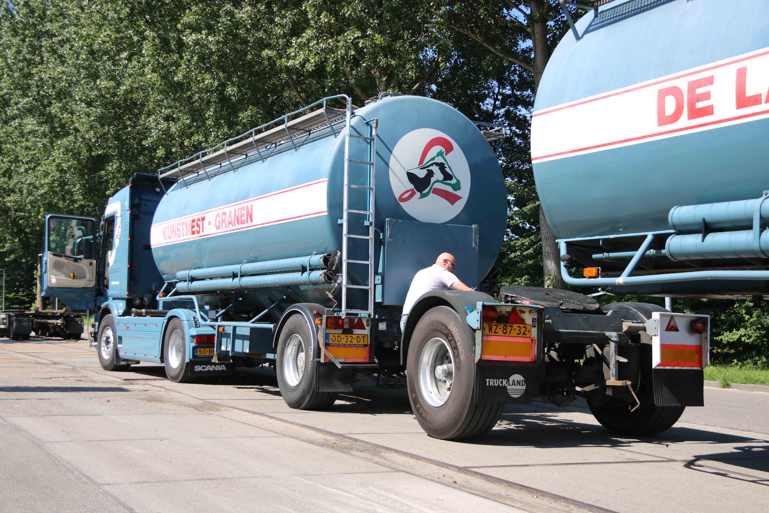 Om die reden werkt Jerry op dezelfde manier als een chauffeur die rijdt op een motorwagen met aanhanger. Jerry tuft met zijn combinatie over de A7 richting Den Oever en demonstreert het direct. Langs de doorgaande weg van het vissersdorp koppelt hij zijn achterste oplegger (inclusief dolly) af. Het eerste losadres is namelijk een boer in de woonplaats van Jerry, Hippolytushoef, in de kop van Noord-Holland. De smalle boerenweggetjes maken duidelijk waarom hij zijn achterste trailer achterlaat. Die bochten zouden hier nooit zijn te maken met twee opleggers. Je hoopt als chauffeur dat je op deze landweggetjes ook geen tegenliggers tegenkomt met één oplegger. “De grond is droog”, zegt Jerry. “Ik zou een stukje berm kunnen meepakken, maar doe dat liever niet.”