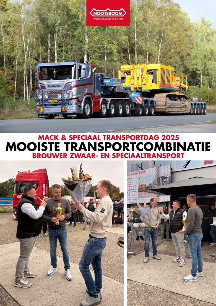 In de categorie ‘Mooiste transportcombinatie’ ging de winst naar Brouwer Zwaar- en Speciaaltransport met hun Scania R7 10×4 en Nooteboom 3+6 EURO-PX dieplader. De jury prees de combinatie vanwege de strakke kleurstelling, de hoogwaardige afwerking en de perfecte gewichtsverdeling van de lading. Robin Brouwer en Patrick van Geffen namen de prijs gezamenlijk in ontvangst.