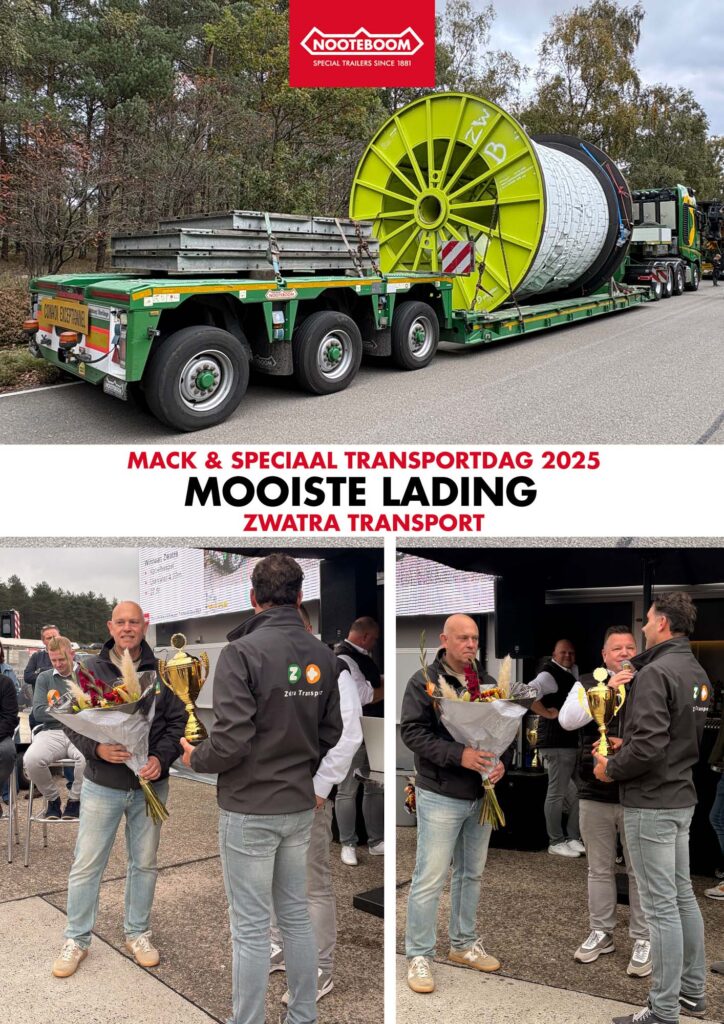 In de categorie ‘Mooiste lading’ ging de winst naar Zwatra Transport, met hun indrukwekkende kabelhaspel op een 3-assige EURO-PX dieplader van Nooteboom. De kabelhaspel, met een diameter van 4,2 meter en een gewicht van 27,5 ton, viel op doordat het geen alledaagse lading is en door de symboliek van de modernisering in de infrastructuur. Dennis de Groot en Mark Heijdra namen de prijs namens Zwatra Transport in ontvangst.