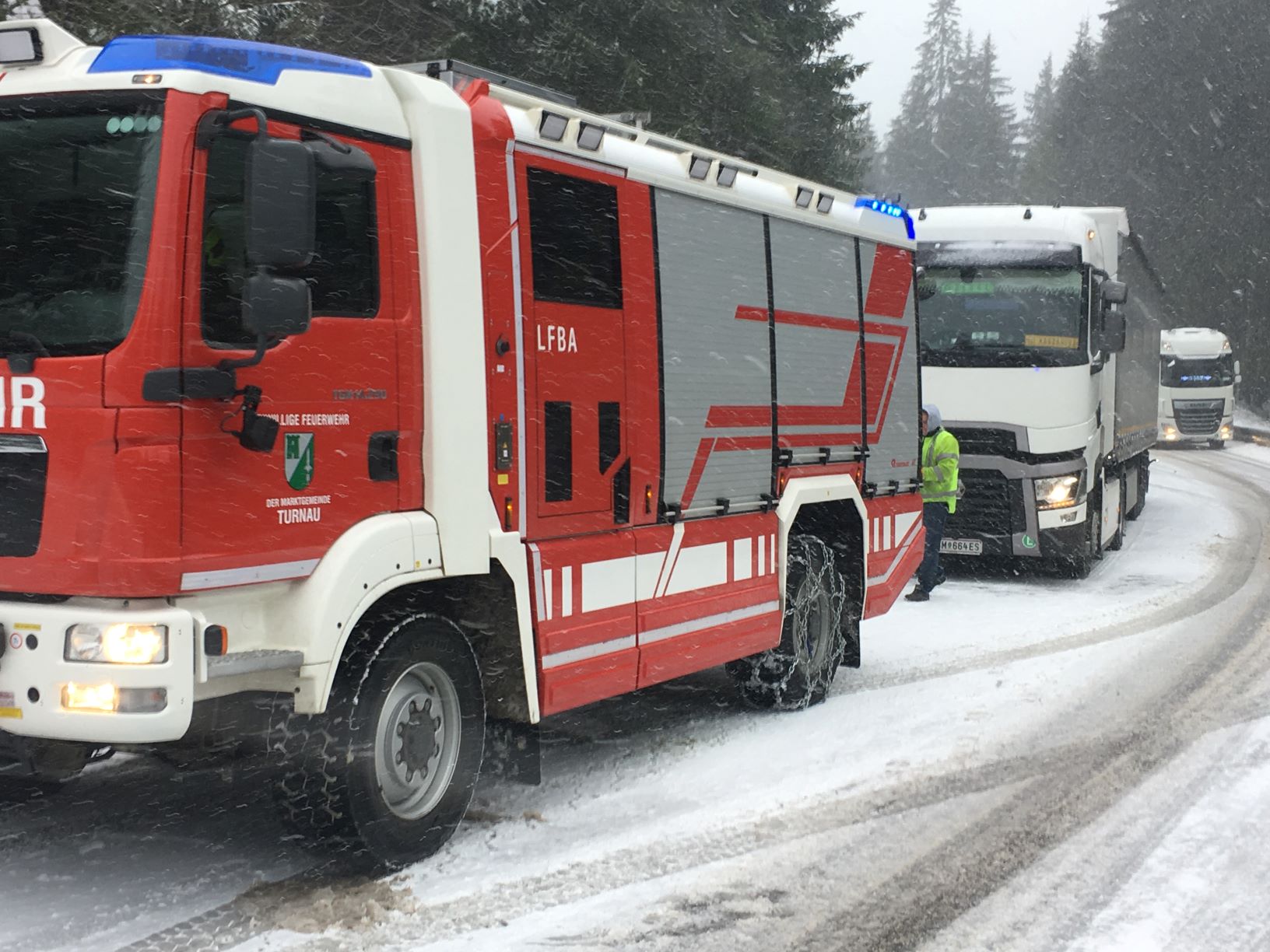 De brandweer van het Oostenrijkse Turnau moest eraan te pas komen om de vrachtwagens uit hun hachelijke situatie te bevrijden. De MAN TGM van de Freiwillige Feuerwehr, uitgerust met vierwielaandrijving en sneeuwkettingen, trok de wagens naar boven.