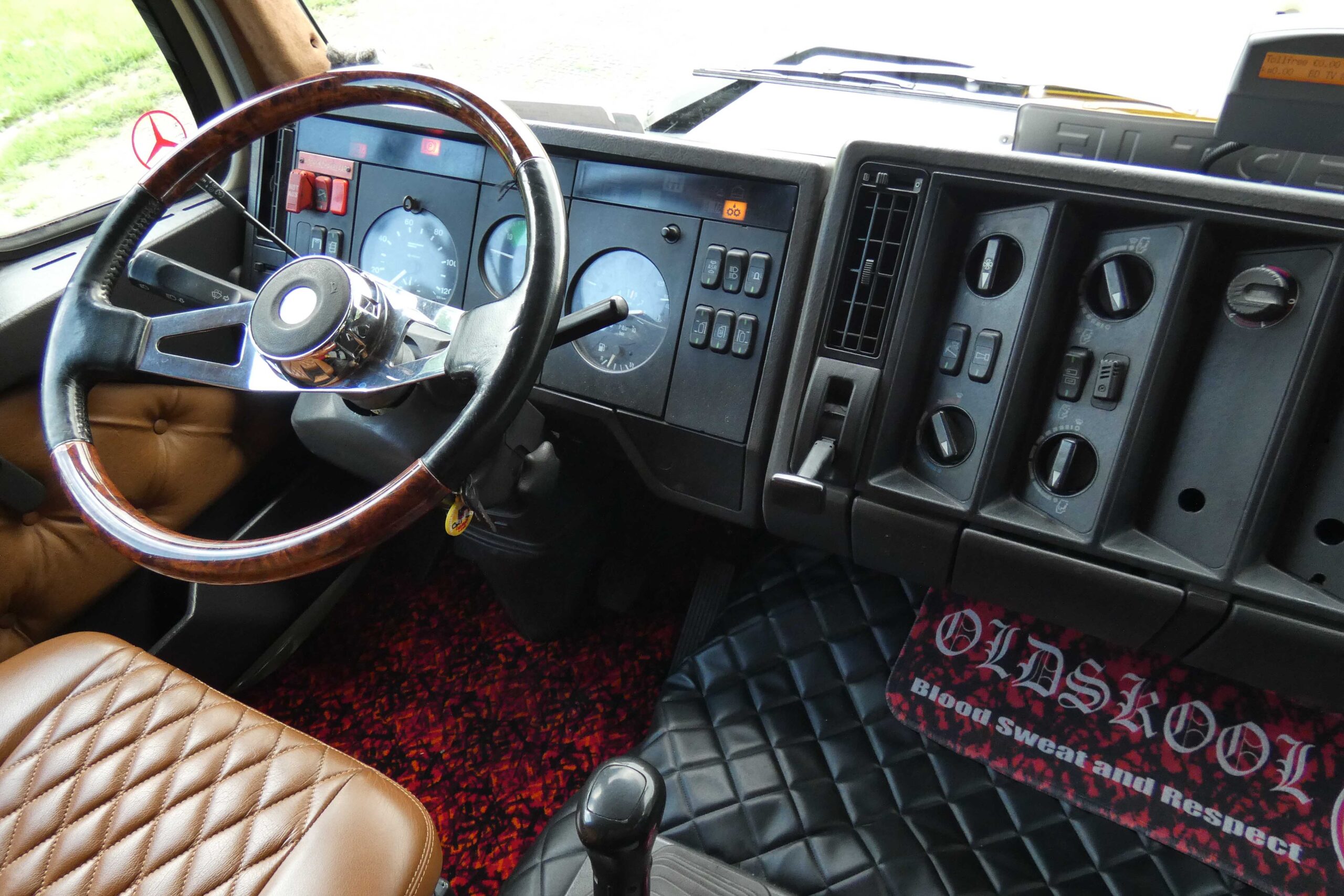 De Mercedes is nu een klein jaar klaar en Simon gebruikt hem voornamelijk voor hobby- en toerritjes. “Hij is wel ADR-gekeurd, dus ik zou er ook gewoon mee aan het werk kunnen”, vertelt Simon verder. Onderweg naar een geschikte fotolocatie blijkt hoe geweldig die SK klinkt (filmpje hieronder). De V8 brult echt uit de staande pijpen, waarbij de turbo tijdens het schakelen zo’n heerlijke fluit laat horen. Heel comfortabel is zo’n losse trekker natuurlijk niet, maar dat geluid maakt alles goed. Ook de eigenaar grijnst van oor tot oor terwijl hij de pook van versnelling naar versnelling laat gaan. “Dit is nog echt rijden”, roept Simon boven het gebrul van de V8 uit. Met de minuut stijgt het enthousiasme in de fraai beklede cabine. Zo leuk om ook eens zo’n minder voor de hand liggende hobbytruck voor de lens te hebben.