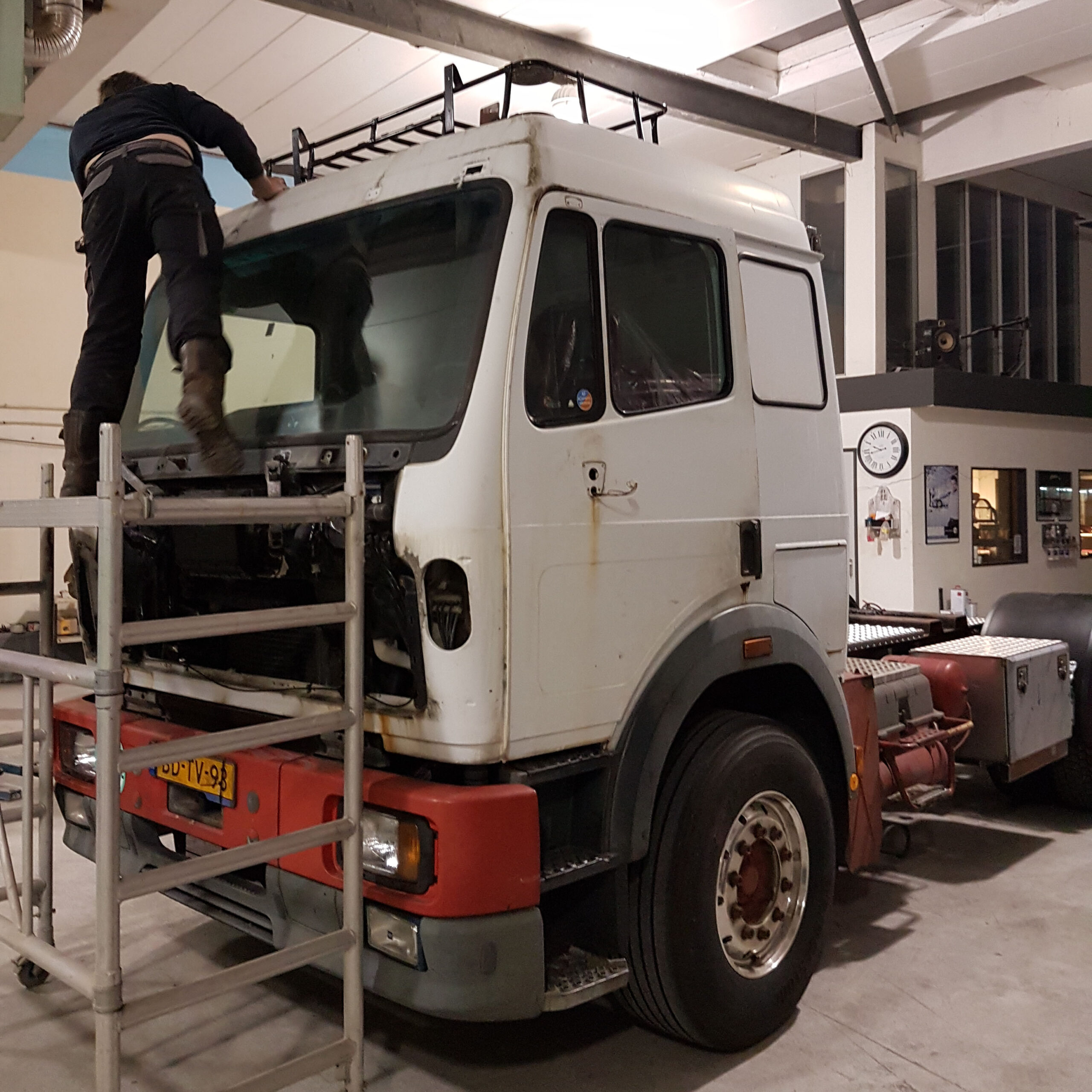 Bij Simon sluimerde er het verlangen ooit weer een SK te hebben. “Die kans deed zich twee jaar geleden eigenlijk ineens voor toen deze te koop kwam”, vertelt hij. “Dit is een originele Van der Laan-trekker, die in 1996 in de vloot kwam. Ik heb hem nog zien komen en ik reed destijds op precies zo’n auto. In 2001 werd deze trekker uit de vaart genomen, maar niet verkocht. In plaats daarvan werd het de terminaltrekker hier op het terrein. Na 2013 werd de Mercedes-Benz SK niet meer gekeurd. Het ging me gewoon aan het hart om zo’n SK toch een beetje te zien aftakelen, vandaar dat ik ooit tegen de beheerder heb geroepen dat ik hem wel wilde kopen. Dat moment kwam in 2018, toen het bedrijf er toch ineens afstand van wilde doen.”
