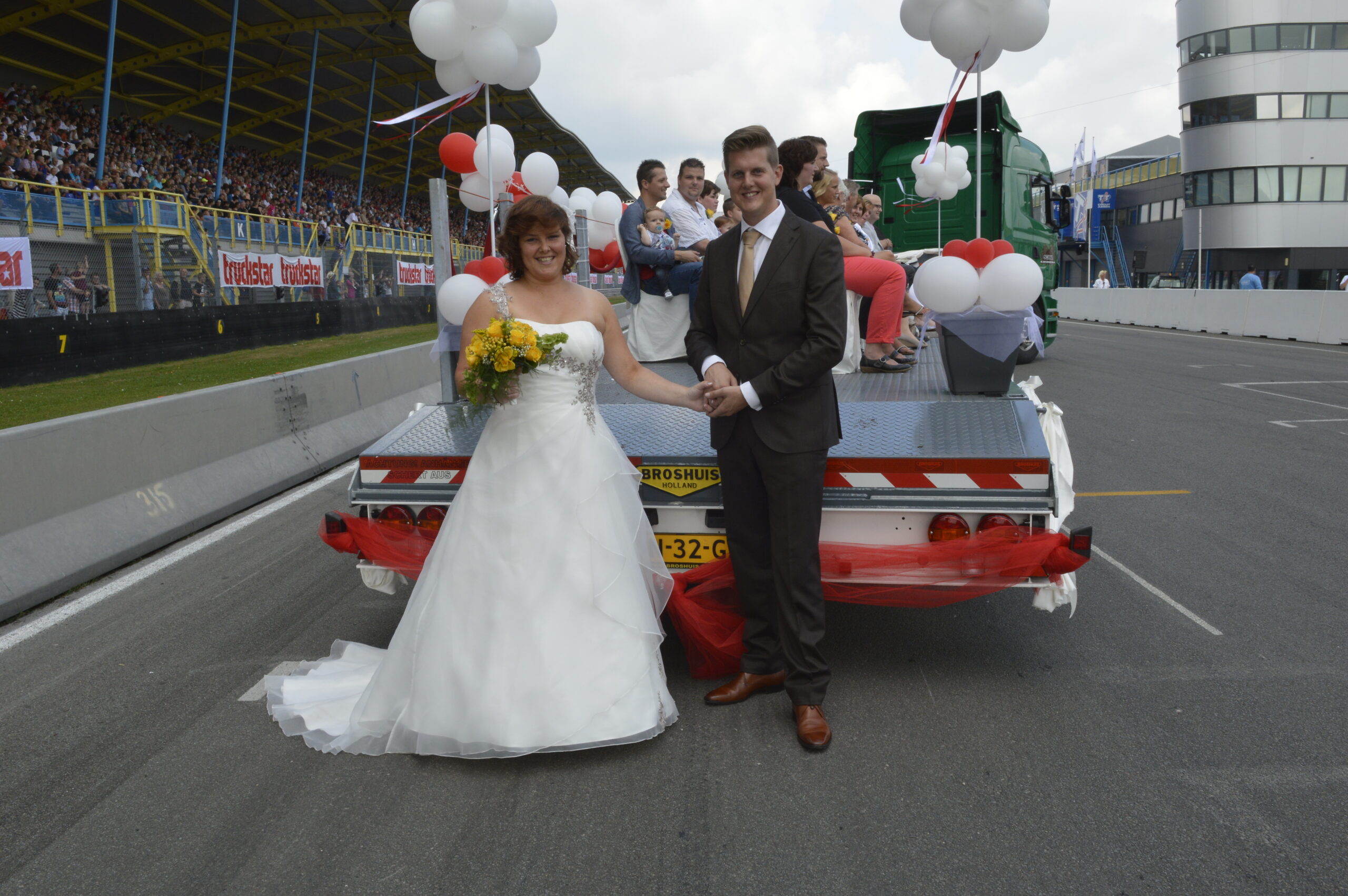 Want zij beloofden elkaar, midden in de gezellige Festival drukte, het ja-woord voor eeuwige trouw. Vergezeld van zoon Gijs (3 maanden), familie, vrienden én het Truckstar publiek beleven zij de dag van hun leven, die zich volledig op het Festival afspeelt. Sjoege Wiersma, ambtenaar van de burgerlijke stand van de gemeente Assen, stelde het koppel om 15.40u uur dé vraag en een helder en enthousiast ‘ja!’ volgde.