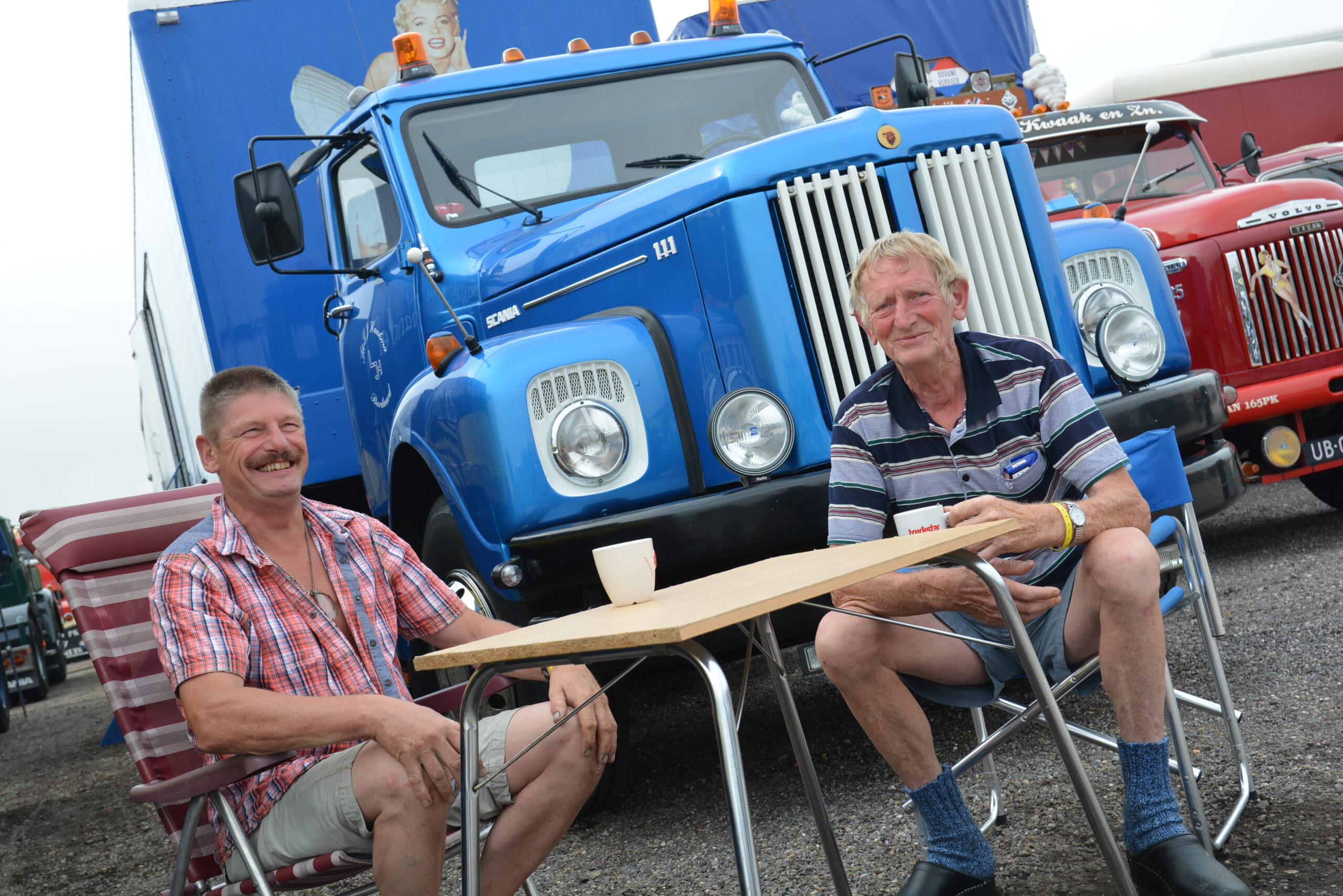 We spreken onder andere met Tjeerd Spijksma (57) en Sake Haakman (74), zittend voor de Scania 111 van Sake en genietend van een bakje koffie (openingsfoto). Sake is oud chauffeur, en komt al jaren met zijn gerestaureerde Scania naar Assen: “We hebben gisteravond eerst genoten van de muziek, en zijn daarna een ronde gelopen over de baan. Ik vind het erg leuk om oude collega’s te spreken. Leuk even buurten, en praten over het vak en vroeger.”