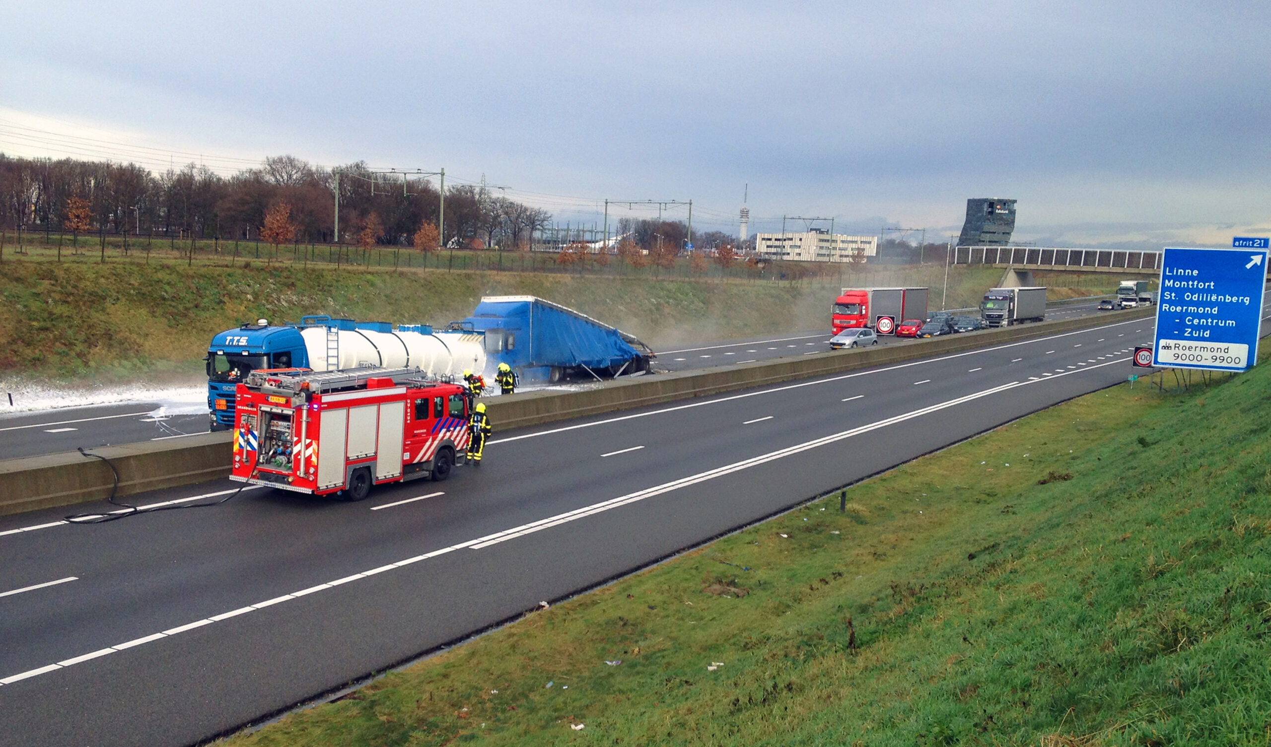 Op de A73 bij Sint Odiliënberg in Limburg lekt woensdagmiddag de bijtende en gevaarlijke stof zoutzuur uit een tankwagen die van achteren is aangereden.